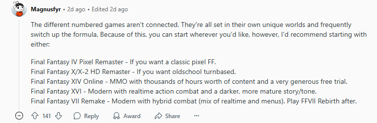 还有不少玩家强推《最终幻想9》和《最终幻想10》,有玩家表示,自己过去五年内玩遍了全系列(包括《最终幻想11》和《最终幻想14》),而《最终幻想9》无疑是其中最特别的一部——仅凭其惊艳的剧情和角色成长线就足够脱颖而出。它甚至可能是自己有史以来最爱的游戏。