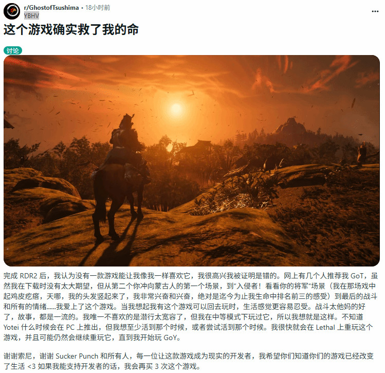 近日,Reddit论坛上的一则热门帖子引发了众多网友的关注。网友YBHV在帖中激动地表示,《对马岛之魂(Ghost of Tsushima)》这款游戏简直就是他的“救命稻草”。