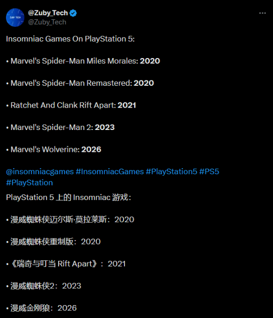 游戏领域的知名博主@Zuby_Tech对失眠组近年来的作品进行了梳理。他发现,自2020年PS5主机问世以来,失眠组几乎每隔一段时间就能推出一款新作,展现出了强大的创作活力。