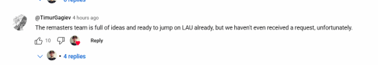 在该视频的评论区中,化名为XProger的帖木儿·加吉耶夫(Timur Gagiev)留言表示:“重制团队极具创意,早已做好着手LAU三部曲重制工作的准备,但令人惋惜的是,至今我们都没有收到任何来自官方的邀约”。