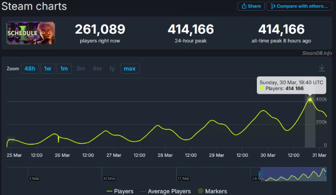 据SteamDB数据显示,3月25日开启抢先体验的《Schedule I》首日即达6万在线峰值,随后几天人气持续攀升,周日更创下41.4万同时在线的佳绩,仅次于常年霸榜的《CS2》。