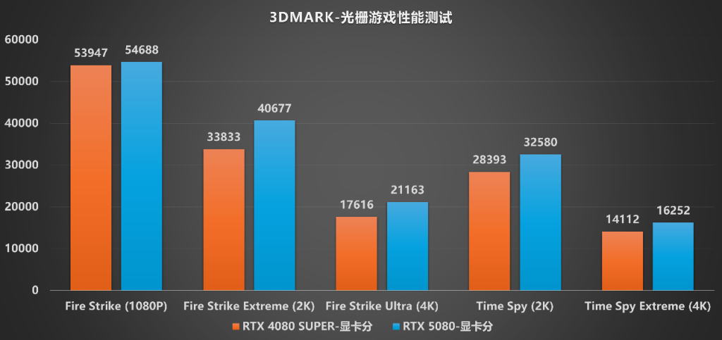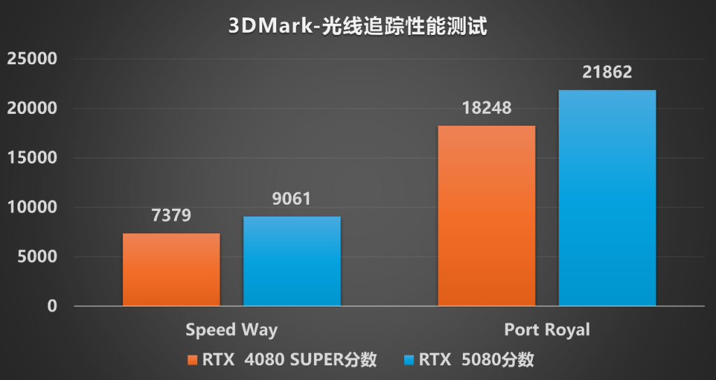 我们以3DMark作为显卡基准性能测试,测试项目包括Fire Strike、Fire Strike Extreme、Fire Strike Ultra、Time Spy、Time Spy Extreme、Port Royal以及Speed Way七个项目。分别测试RTX 5080雪鹰在2k和4k分辨率下的性能表现。从表上可以看到,由于性能完全溢出,无论是上一代的RTX 4080还是这张技嘉RTX 5080雪鹰显卡在Fire Strike下的表现可以说是不分伯仲,但是当分辨率提升到2K甚至4K,两张显卡之间的性能差距就变得十分显著。而在两项光线追踪测试中,而考虑到这两张显卡在硬件规格上差距相当轻微,技嘉RTX 5080雪鹰在这五项测试中如此可观的性能提升,RTX 50系Blackwell GPU从底层架构开始的彻底变革与GDDR7显存在性能上的大幅提升功不可没。
