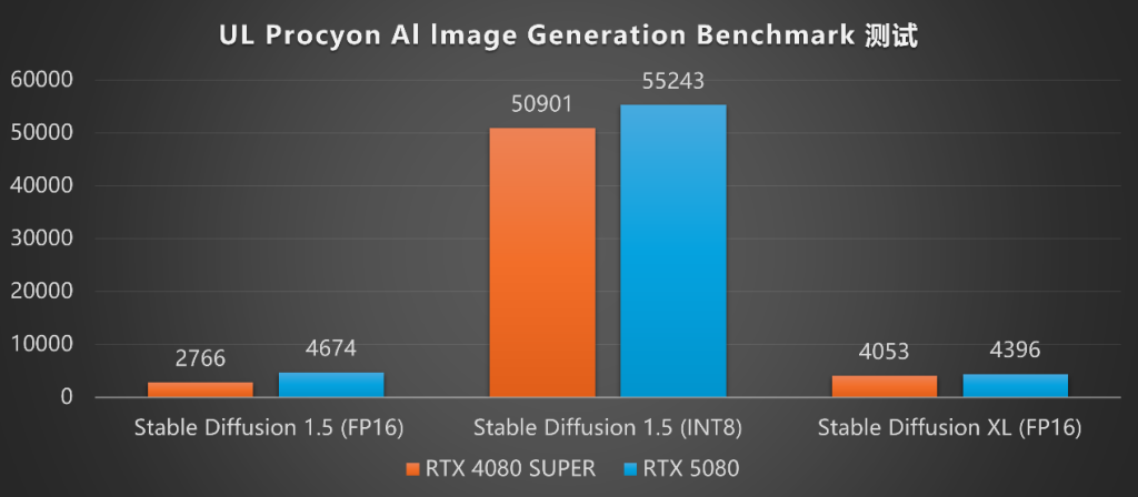 在UL Procyon的AI图像生成测试中,这张技嘉RTX 5080雪鹰也凭借着最高超越RTX 4080 SUPER 67%的幅度一骑绝尘,而应用到实际生产力工作中,RTX 5080雪鹰将会为用户提升不少的效率,节省工作的时间,缩短图片、视频等项目的渲染时间,十分受用。