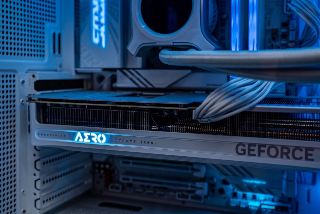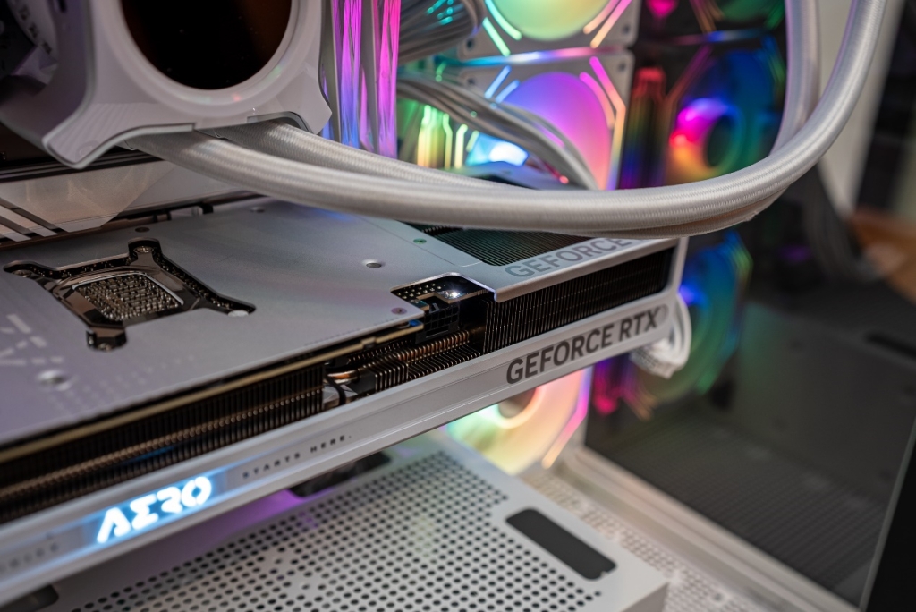 RTX 5080雪鹰侧面的 “AERO” Logo 内置 RGB 灯光系统,其独特之处在于,从不同角度观看时,会呈现出不同的色彩,为玩家带来别样的视觉体验。用户只需通过技嘉智能管家(GCC)软件,即可轻松调节灯效。此外,该灯效还能与其他设备实现同步,打造出统一、炫酷的整机灯光氛围,让你的电脑主机成为桌面的视觉焦点。