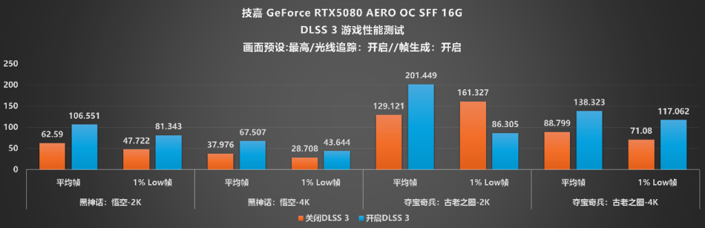 除了测试的几款游戏之外 ,还有很多游戏即将对这一革命性的帧生成技术敞开怀抱,例如国产3A的开山鼻祖《黑神话:悟空》以及最近相当热门的《夺宝奇兵:古老之圈》。我们使用DLSS 3在这张技嘉RTX 5080雪鹰上测试了它们的表现,效果也是相当可观,即使是这两款全景光追加持、显卡要求极高的巨作,在RTX 50系GPU高性能的辅助下也能够轻松实现4K 60帧+的游戏体验,这意味着在DLSS 4正式上线后,使用技嘉RTX 5080雪鹰实现超高画质全景光追4K 120帧的体验并非不可能。