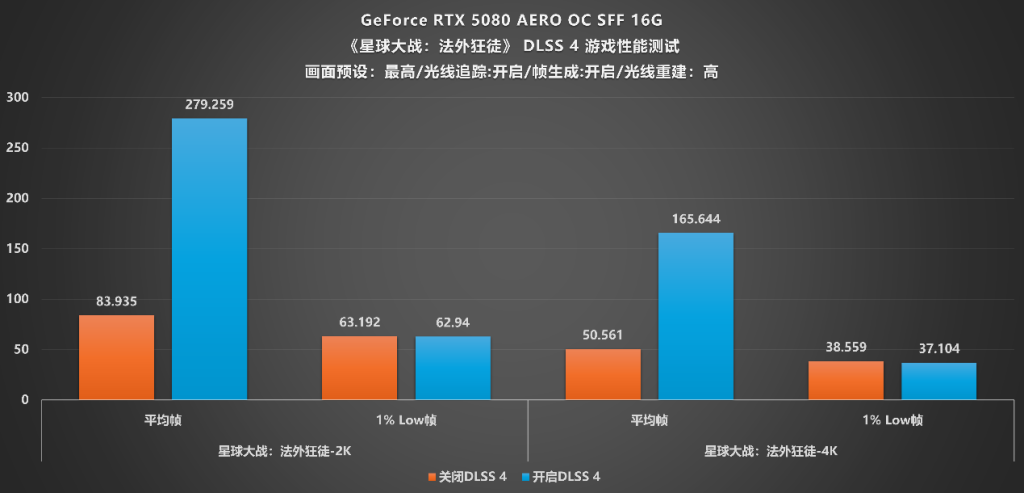 前段时间由育碧推出的星球大战:亡命之徒由于其多样的艺术风格与先进的技术实现也同样是DLSS 4技术的良好秀场,我们在上面同样测到了不错的性能提升。凭借着DLSS开启后在4K分辨率超165帧的成绩与游戏电影级别的演出效果,玩家能够完全沉浸在这个育碧打造的星战世界!