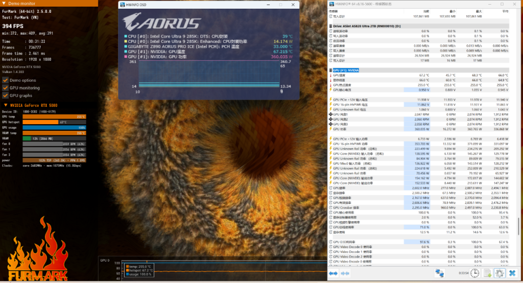 值得一提的是,RTX 5080雪鹰的风扇表面纹理经过特殊设计,使其完全符合空气动力学原理,在运行时能够有效降低风阻,减少空气紊流,从而降低了运行噪音。经过技嘉的专业测试,其风压相较于前代提升了 53.6%,风冷效果增强了 12.5%,让显卡在高效运转的同时,能迅速散发热量,维持稳定的工作状态。并且RTX 5080雪鹰还搭载了智能风扇启停技术,让显卡在低负载运行或处于低温环境时自动停止风扇的运转,这一贴心设计避免了不必要的风扇转动噪音,为用户营造安静舒适的使用环境,让玩家在日常办公、轻度娱乐时免受噪音干扰,专注于手头事务。同时我们也为其进行了长达半小时的“甜甜圈”烤机测试,从上图可见,即便是在满载360W的情况下,技嘉RTX 5080雪鹰显卡与技嘉Z890 AORUS PRO ICE主板的温度也始终在正常范围,中途也并未出现蓝屏和死机的情况,散热性能堪称优异。