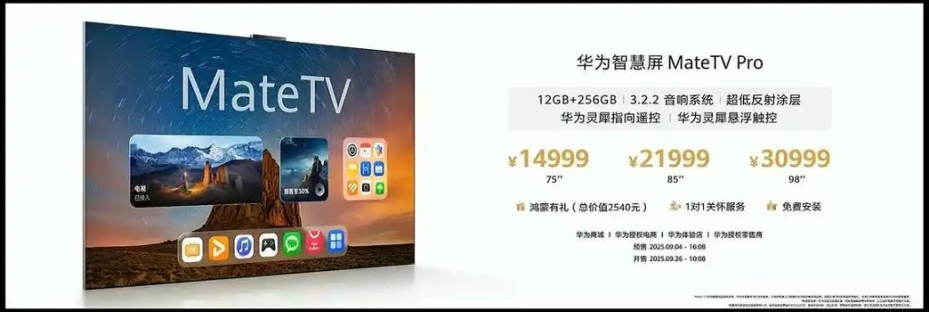 版本与售价:提供标准版(65吋8999元、75吋11999元、85吋15999元、98吋24999元)和Pro版(75吋14999元、85吋21999元、98吋30009元),2025年9月4日16:08开启预售,9月26日10:08正式开售。