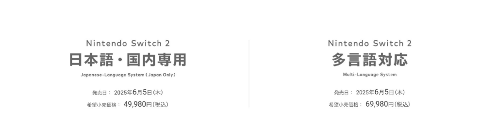 在昨晚的任天堂发布会上,新一代主机Switch2确认将在今年6月5日发售。任天堂将推出“日本国内专用版”和“多语言国际版”两个定价策略,日本专用版售价比多语言国际版少1000元,无法登录日服以外的账号,主机语言仅限日语。