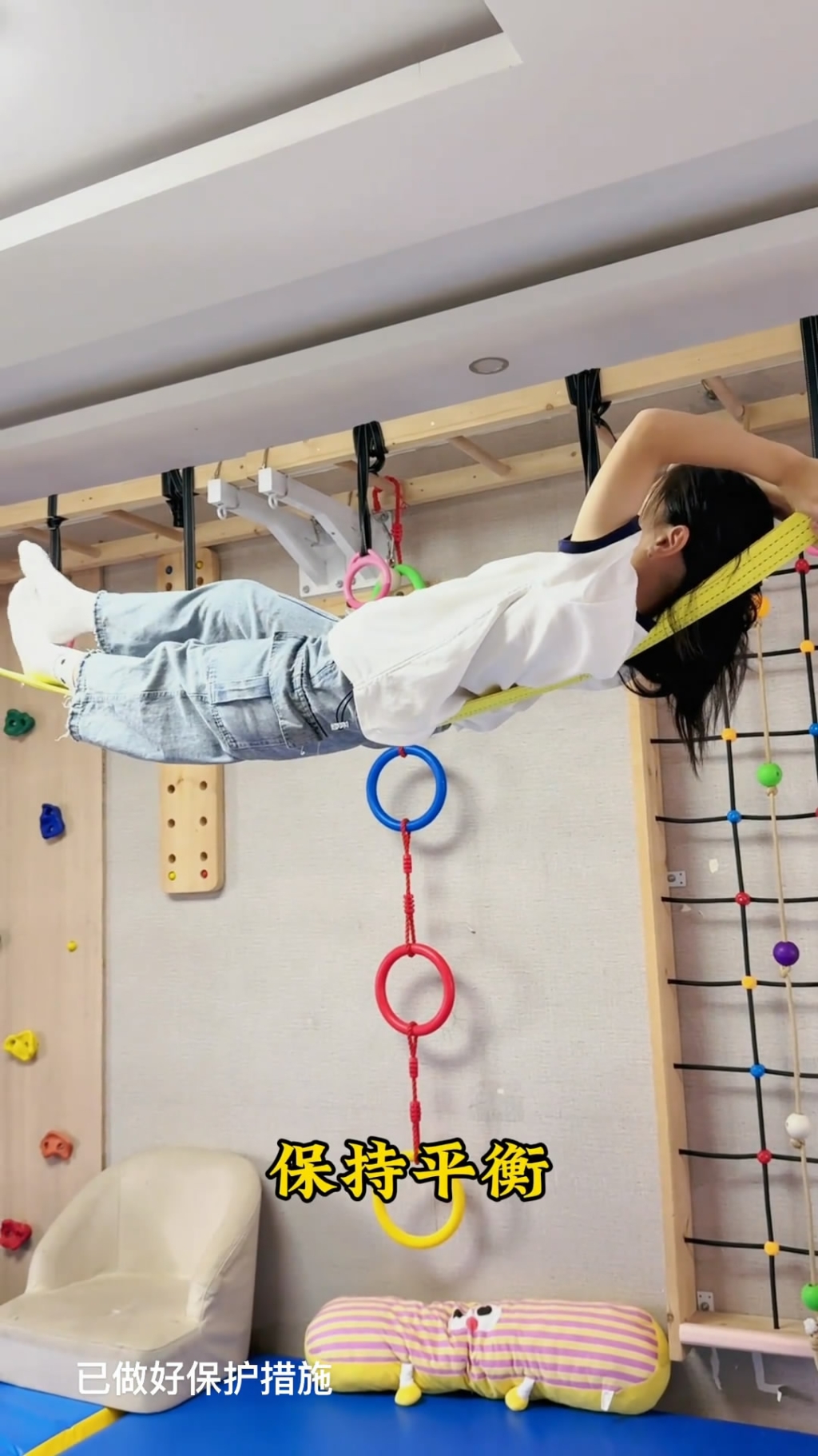 据悉,该女孩已能持续在绳上保持躺卧状态约十分钟,上下绳索的动作也是行云流水,尽显非凡天赋。